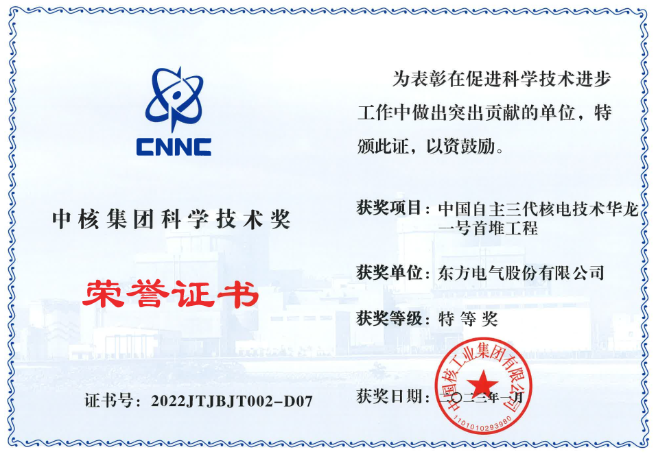 鉴于在“中国自主三代核电技术华龙一号首堆工程”研发和供货工作中的突出贡献,近日东方电气荣获中核集团科学技术奖特等奖。