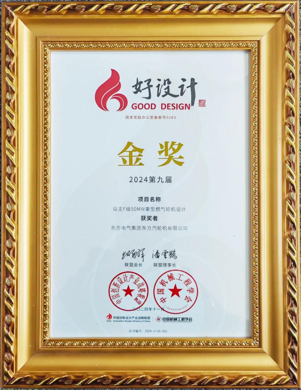 11月18日至19日,2024中国创新设计活动周暨第九届好设计颁奖大会在浙江省召开。在中国创新设计产业战略联盟副会长兼理事长、中国工程院院士潘云鹤等10位院士的共同见证下,东方电气集团所属东方汽轮机申报的《自主F级50MW重型燃气轮机设计》获得2024好设计金奖。好设计奖是唯一的国家级设计创新专项奖,代表了我国设计创新发展趋势。