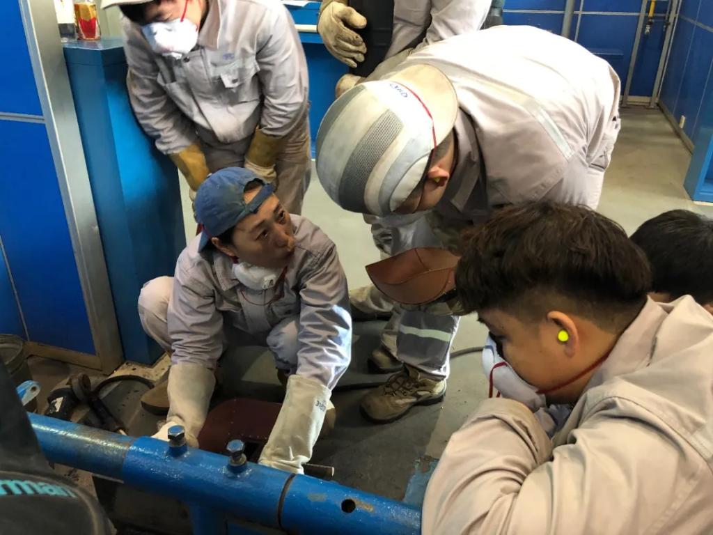 “火星飞溅到鞋子里时最难受,也不能挪动,鞋子勒得紧,只能等它自己降温。” 即便穿着防护服、耐高温鞋,焊工体感温度依然达到45℃。“我用废旧木架做了隔热工装,脚底就没这么烫了,木架陪着我们焊了一台又一台,用到快散架了,大家还舍不得扔掉。”没有先进经验可以借鉴,白映玉只能靠自己不断摸索、不断总结。“这条焊缝一次性焊接成功率低,主要原因是在高温、狭小空间内作业,每一班要2个焊工轮着进去,每一次只能在筒内待15到20分钟,而每个人操作手法又不一样。”找到了难点突破口,白映玉带领团队成员进行焊接前的风险防范,对工位、焊机、焊接参数和作业流程都制定了明确详细的操作标准。