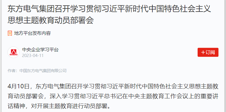 4月10日,东方电气集团召开学习贯彻习近平新时代中国特色社会主义思想主题教育动员部署会,深入学习贯彻习近平总书记在中央主题教育工作会议上的重要讲话精神,对开展主题教育进行动员部署。